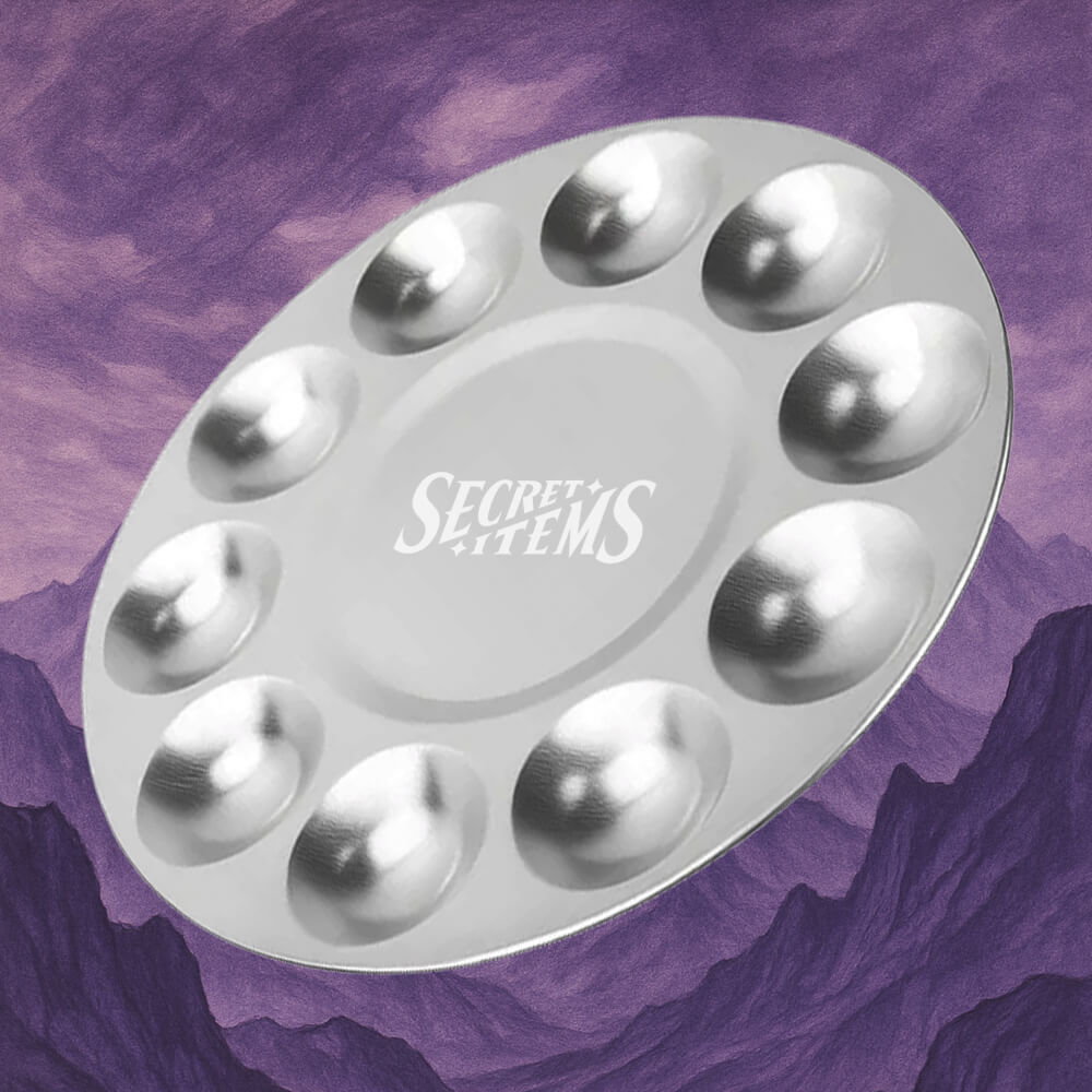 This aluminum durable paint palette provides a clean and organized surface for mixing paints. Made of lightweight and rust-resistant aluminum, it's easy to clean and ideal for both studio use and transport. Sacred SECRET ITEMS logo engraved.